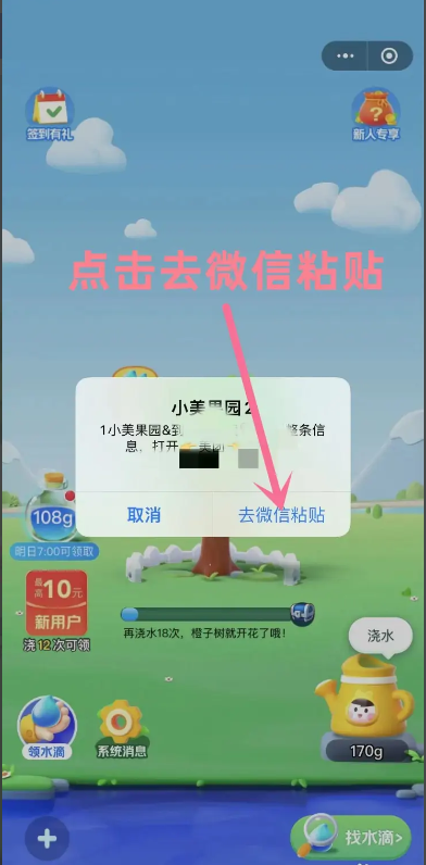 4、会生成小美果园的链接,点击“去微信粘贴”,即可跳转到微信,选择微信好友粘贴并调诉发送,等待对方同意即可。