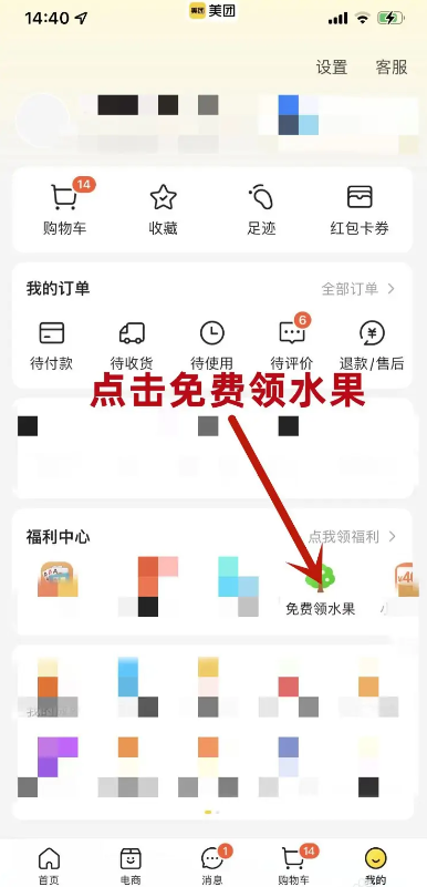 1、打开手机美团APP,点击右下角“我的“,然后点击该页面“福利中心”中的“免费领水果”。