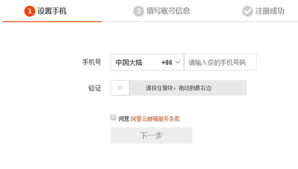 3.填好手机号后,验证通过,勾选“同一阿里云邮箱服务条款”并点击下一步继续注册,然后要求输入手机的短信验证码。