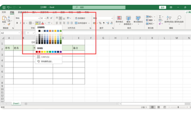 然后把单元格选中,点一下选项栏的开始,点字体,点击颜色,可以给表格增加颜色。