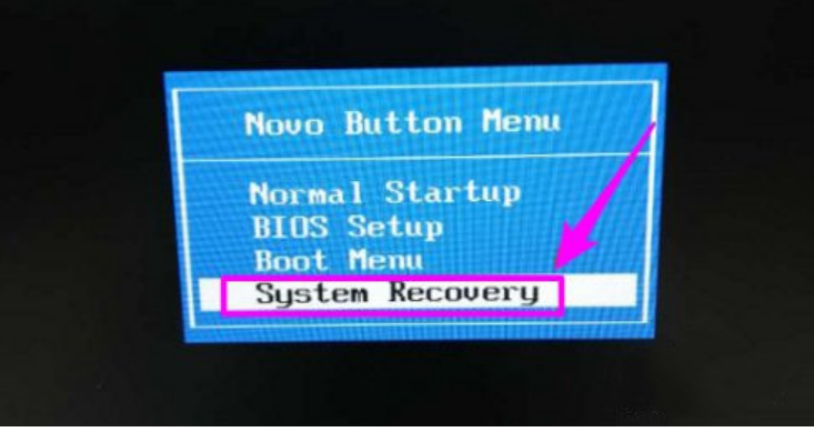 找到联想小新侧边上的系统重置开关,然后通过键盘上的方向箭头,点击选择“system recovery”。
