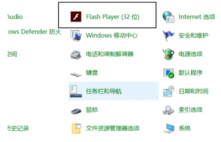 3、在控制面板窗口中所有的设置项,点击Flash Player(32位)图标。