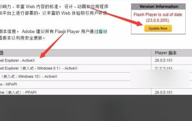 6、打开Flash官方网站,在这里可以看到最新的Flash版本号,如果版本比较低,点击“update now”按钮。