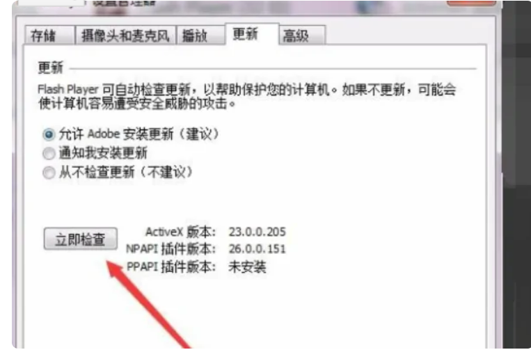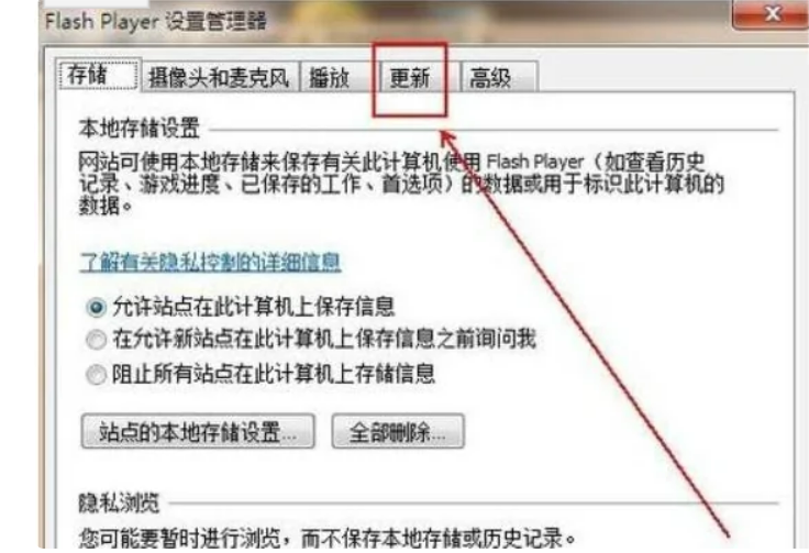 4、在打开的Flash Player设置管理器窗口中,点击“更新”标签。