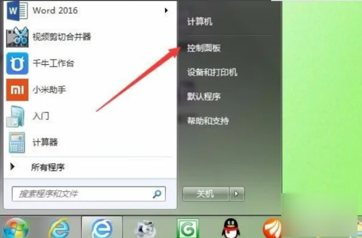 1、点击左下角的开始,在弹出菜单中选择“控制面板”菜单项。