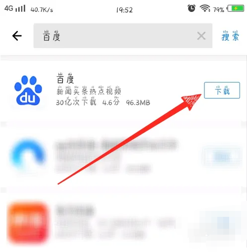 3、在搜索结果中找到百度并点击右侧的下载按钮。