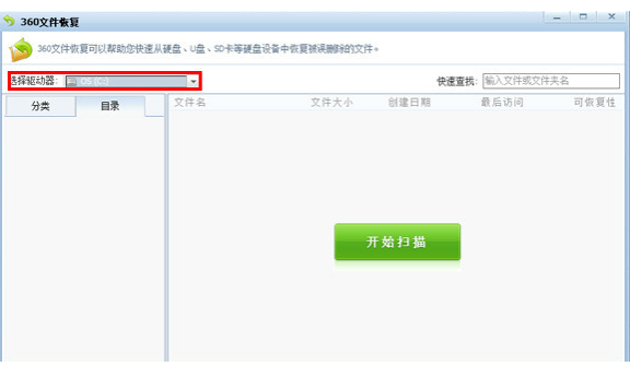 2.首先下载运行360文件恢复工具,在选择驱动器中选择手机盘符,点击开始扫描。扫描结束后将聊天记录到处到微信账户文件夹中。