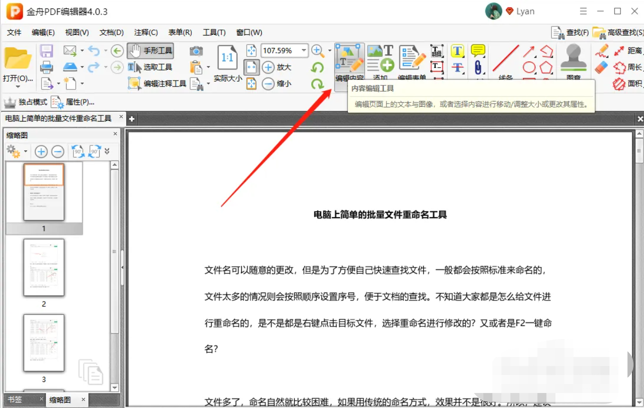 打开文件后,点击选择“编辑内容”工具,也可以选择需要处理的对象,默认情况下是对所有对象(包括图片、文字、水印等内容)