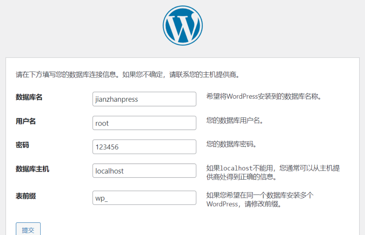c、分别输入数据库名、数据库用户名、数据库密码后点“提交”。数据库主机与表前缀一般使用默认的localhost和wp_就可以。如果同一数据库中有多个wordpress程序,请务必将前缀修改为其它,比如,wp_jzp_。
