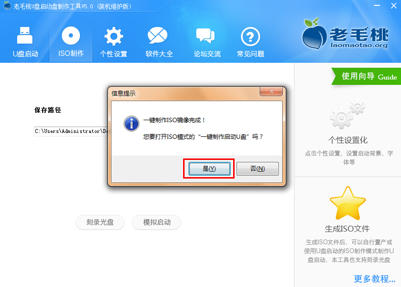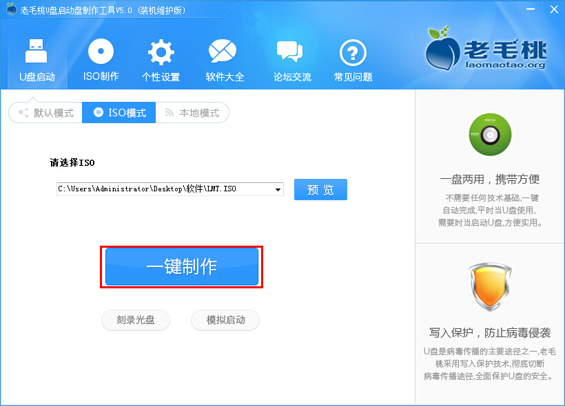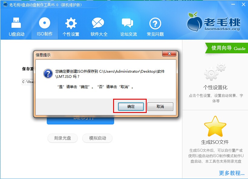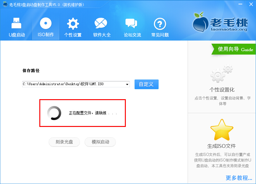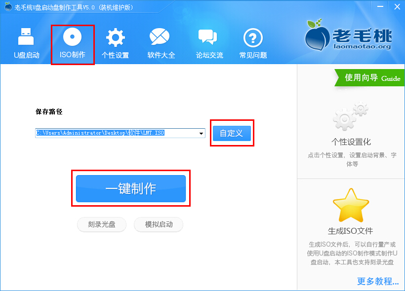 1.首先我们将老毛桃u盘启动制作工具打开,在打开的窗口中点击“iso制作”,接着点击“自定义”选择iso制作的“保存路径”,然后再点击“一键制作”即可;如下图所示: