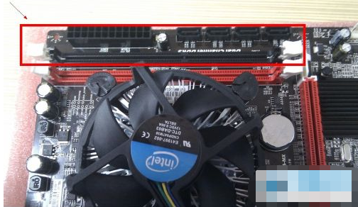 1,首先我们需要知道主板上哪一个是内存插槽!如下图所示,已经红框标注: