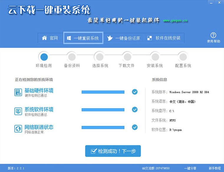 2、软件自动检测电脑软硬件环境以及电脑网络连通状态,完成后点击“检测成功!下一步”按钮。