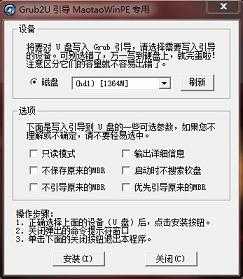 第五步:下面进入Grub2U引导写入阶段,必须注意的是,在磁盘选择上千万不能选成电脑的硬盘了,否则后果很严重的(但也不用过分担心,因为理论上电脑硬盘一个分区往往比咱们的U盘容量大很多,从容量上很容易判断出U盘的),以小编的2G容量的U盘为例,应该选择容量为1925M的磁盘(U盘实际容量往往比标称容量要小一些,很容易判断的),选项中的可选参数最好保持为空,一个也不要勾选,默认即可,直接点击“安装”