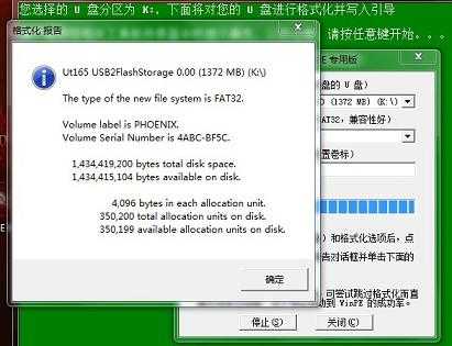 第四步:当系统格式化进程结束后,会弹出本次格式化的一些数据结果,这表示您的格式化已经成功,直接点击“确定”