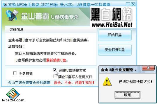 金山U盘病毒专杀提供的“创建U盘快捷方式”用于帮助用户轻松创建安全打开U盘的快捷方式,如图所示,用户只需勾选“创建U盘快捷方式”选项即可轻松创建U盘快捷方式。