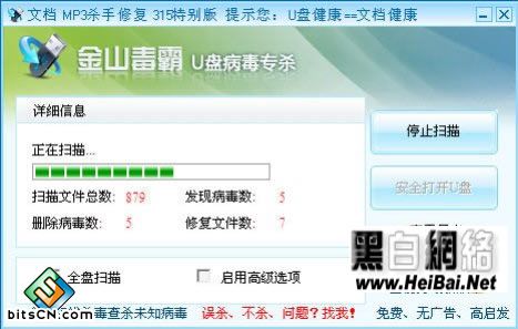 金山U盘病毒专杀可启发清除已知和未知的U盘病毒,用户只需点击界面右侧的“开始扫描”按钮即可运行扫描程序,如图所示。