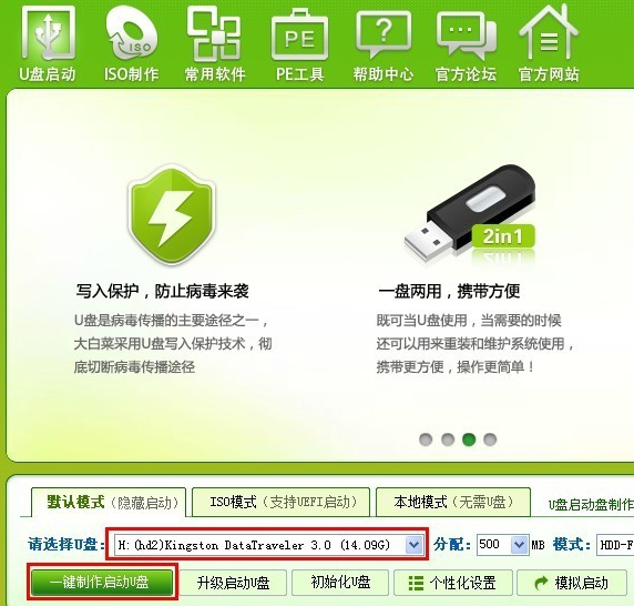 1、打开大白菜U盘制作工具,插入U盘,(建议将U盘重要数据备份),然后点击一键制作启动U盘