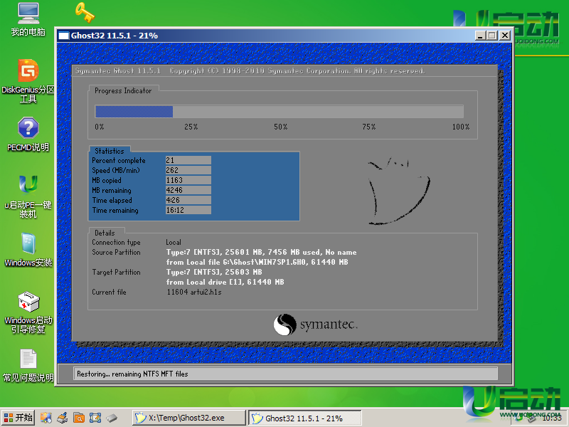 6、此时工具正在将系统镜像文件释放到所选择的硬盘分区中中,耐心等待此过程完成后重启电脑即可,如下图所示:
