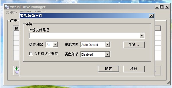 6、装载映像文件:点击装载,找到你的U盘上的ISO文件,路径浏览记住虚拟盘符为A,确定后,最小化放在任务栏边