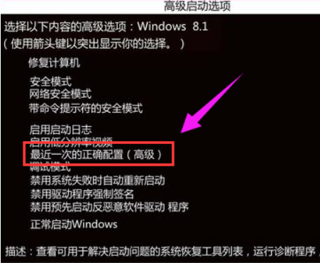 1、重新启动计算机,当出现可用的操作系统列表时,按F8键,在Windows高级选项菜单屏幕上,选择“最后一次正确的配置”,按回车键。