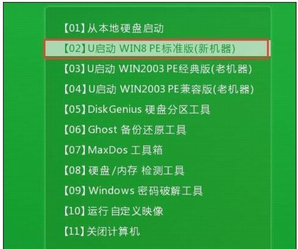 1、自行借助u启动工具先制作好u盘启动盘,然后插入启动盘进电脑后按开机启动快捷键进入u启动主菜单界面,选择“【02】u启动win8pe标准版(新机器)”并回车。