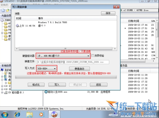 如图示,“硬盘驱动器”里就是选择你要刻录的U盘,这里演示用的是一张数码相机的内存卡。写入方式默认是USB-HDD+,还有USB-HDD、USB-ZIP、USB-ZIP+,共四种供选择,这主要取决于你的主板支持的启动类型,可以在刻录前进CMOS看一下,注意有的主板需要插入U盘才会显示支持的类型。U盘可以在刻录前格式化,也可以通过底下的“格式化”按钮进行,当然直接点“写入”也可以,会自动格式化。