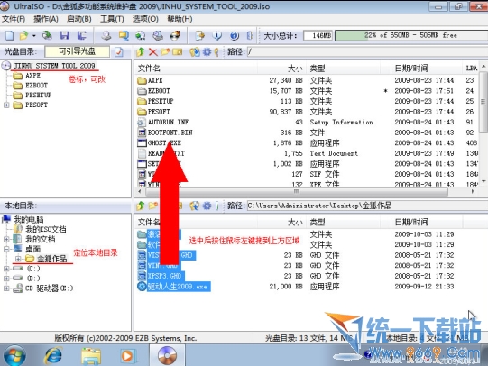 由于维护盘不含GHO系统文件,所以刻录时需添加,刻录前已经在桌面上新建了一个“9669文件夹”的文件夹,里面放了WIN7.GHO、VISTASP2.GHO、XPSP3.GHO三个系统文件,还有“激活工具”以及“软件包”,准备用驱动人生2009带网卡驱动的单文件版替换原来不带网卡驱动的版本。相关方法如图示,在UltraISO界面左下角的“本地目录”里定位到桌面上的“9669文件夹”这个文件夹,它里面的所有文件会在右下角显示,把要加入ISO镜像的所有文件选中后按住鼠标左键拖到右上角的区域。