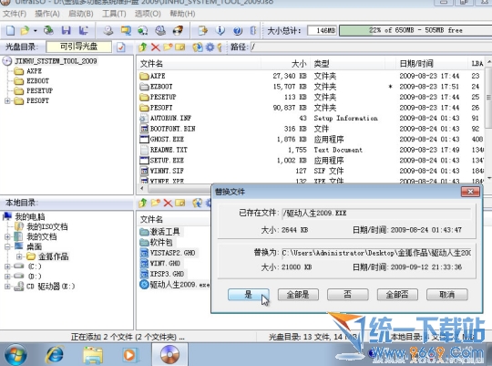 要添加的文件如果原来ISO镜像里已经存在会弹出“是否替换”的提示,确定要替换就选“是”,这样就完成了ISO镜像的修改。如果以后还需要用到这个修改过的ISO镜像的话,可以通过点击“文件”菜单下的“保存”或“另存为”保存修改后的ISO镜像。