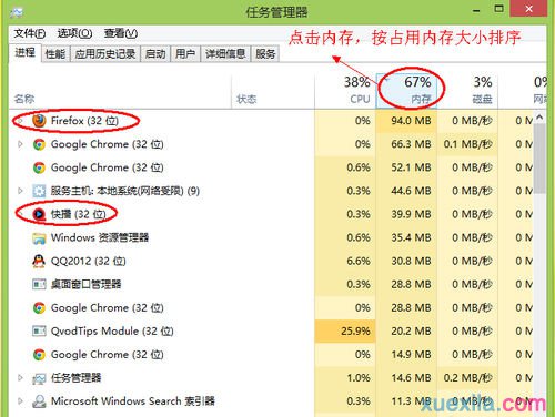 这时,我们可以切换到任务管理器的“进程”选项卡,然后再点击“内存”,让系统按占用内存的大小来排序,如下图所示。