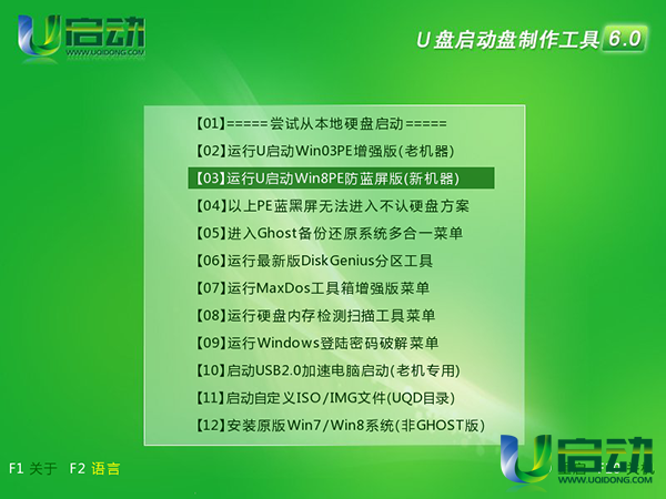 1、把u启动u盘启动盘插入计算机usb接口,然后打开电脑,在出现开机画面时,用一键u盘启动快捷键的方法进入到u启动主菜单界面,并选择【03】运行u启动win8pe防蓝屏版(老机器),按回车键确认选择,如下图所示: