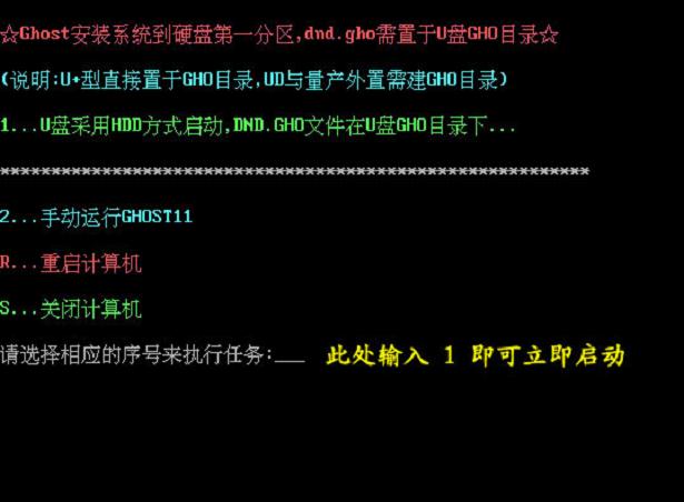 插入U盘启动后点击“不进PE安装系统GHO到硬盘第一分区”即可进入安装系统状态了: