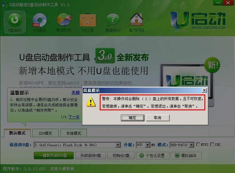 回答:继续上面的操作,我们现在插入需要制作启动盘的U盘,U启动将会自动识别U盘详细信息,如下图: