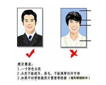 3.所有照片都必须是最近的正视图无色头像,头像占照片大小的2/3,白色背景无边框,图像清晰,层次丰富,表情自然,并且没有明显的失真。照片尺寸为35mm×25mm,像素413 * 295。