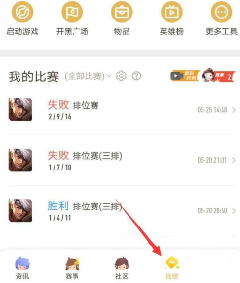 1、我们需要进入王者营地。然后点击最下方的战绩选项。