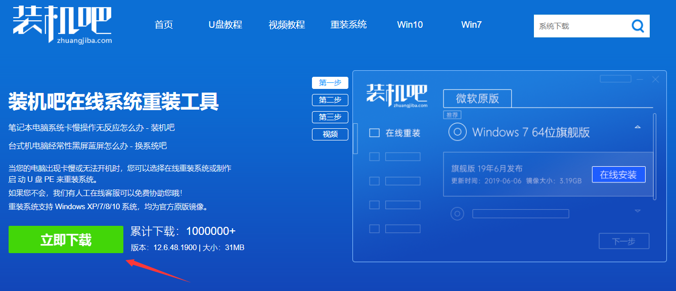 1.首先百度搜索“装机吧官网”进入官网点击装机吧系统重装工具的【立即下载】。
