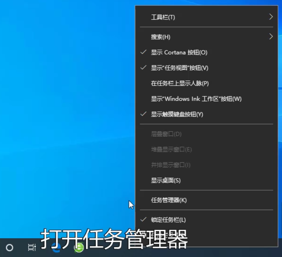 1、鼠标右键点击桌面下方的任务栏,然后在任务栏菜单中点击“任务管理器”。
