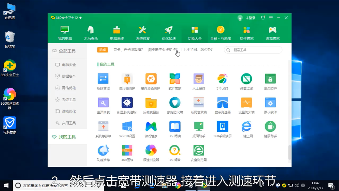 方法一:打开360安全卫士,在功能大全里面找到宽带测速器。