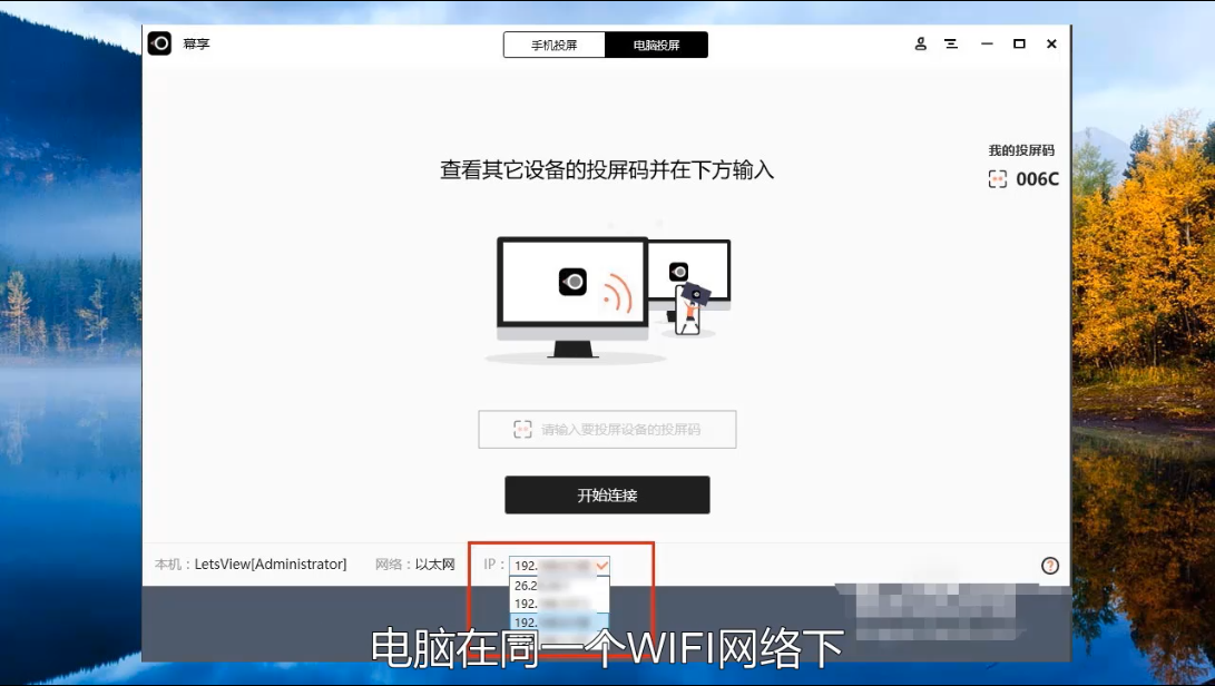 2、在一台电脑上输入另一台电脑的投屏码,然后点击开始连接。
