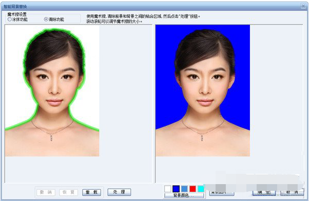 2.然后就是替换证件照片的背景,只要单击“背景处理”,软件就会自动将前景和背景分开,您可以通过选择一个来轻松完成证件照片背景的替换。颜色。
