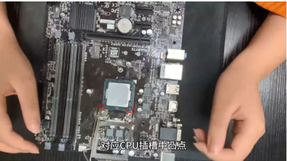 1、首先我们在主板上安装cpu,我们先找到CPU边上的两个凹槽,然后找到主板插槽中的两个凸点,然后打开CPU插槽的上盖,将凹槽对准刚刚找到的凸点放上去。放上去之后,将插槽盖盖好即可。(如果是新机是需要在cpu上涂抹散热硅脂)