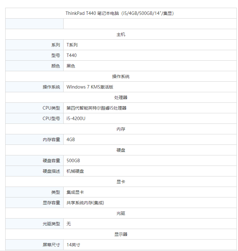 2、从上面的参数中,可以得知,联想t440是属于商务笔记本,轻便易携带,功耗发热低、续航长,但是性能偏弱。如果只是工作使用,这个配置是很好的了。