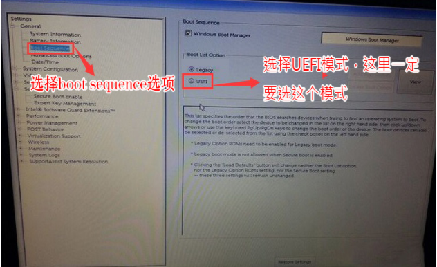 1、开机或重启戴尔电脑,也就是在出现戴尔Logo的时候,连续按F2进入Bios,切换到Boot Sequence项,将Boot list Opion引导模式选择为UEFI。这里一定要设置UEFI,要不然戴尔电脑会引导不了;
