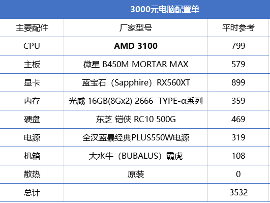 1、3000元网游入门电脑配置
