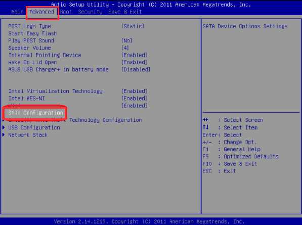 2、电脑进入BIOS后,通过键盘左右键将界面切换至“advanced”窗口,找到“SATA Configration”回车键进入。