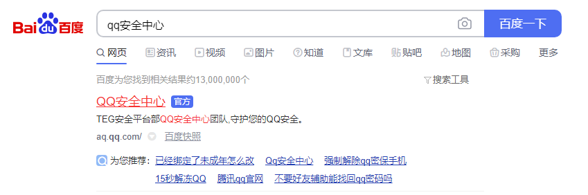 1、首先我们先打开一个浏览器,然后在百度中输入“QQ安全中心”,单击“百度一下”按钮。