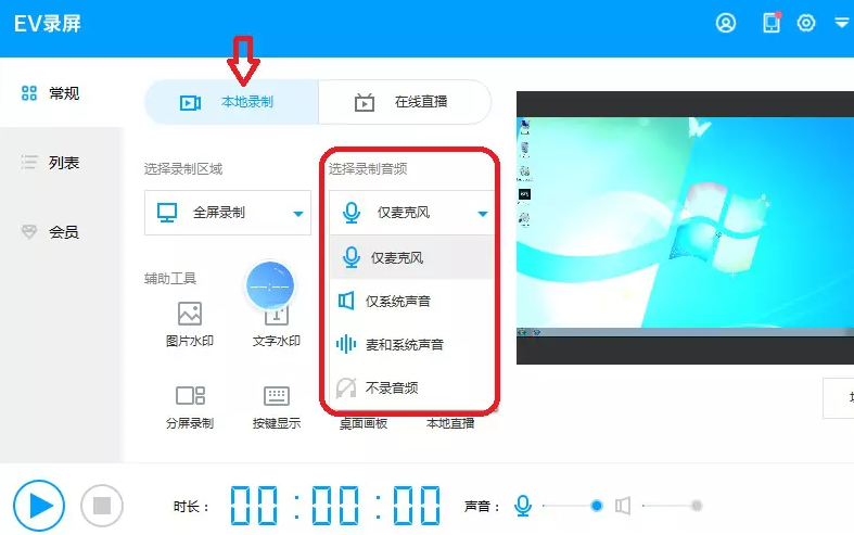 点击本地录制,然后点击“选择录制音频”右下小三角,在下拉菜单里选择录入音频的方式。