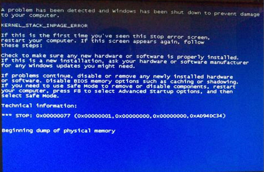1、错误检测信息包括错误符号和错误代码,其中错误符号一般显示在屏幕的最上方,常见的有KERNEL-STACK-INPAGE-ERROR,INACCESSIBLE-BOOT-DEVICE,IRO-NOT-LESS-OR-EQUAL等;而错误代码主要显示在屏幕中间,包括一串以“STOP”为开头的16进制代码(如0x00000077,0x000000A7等)和括号中的参数。
