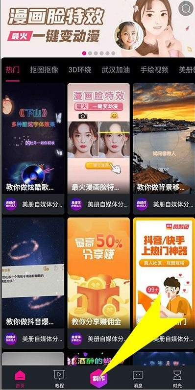 1、下载一个美册然后首页,点击制作按钮,进入“特效视频专区”“神奇抠像”分类,里面有很多的飞天模板,选一个你喜欢的模板效果。