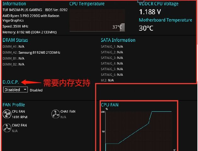 进入BIOS界面后,找到D.O.C.P的选项,就是内存超频的选项,但是需要内存本身支持。