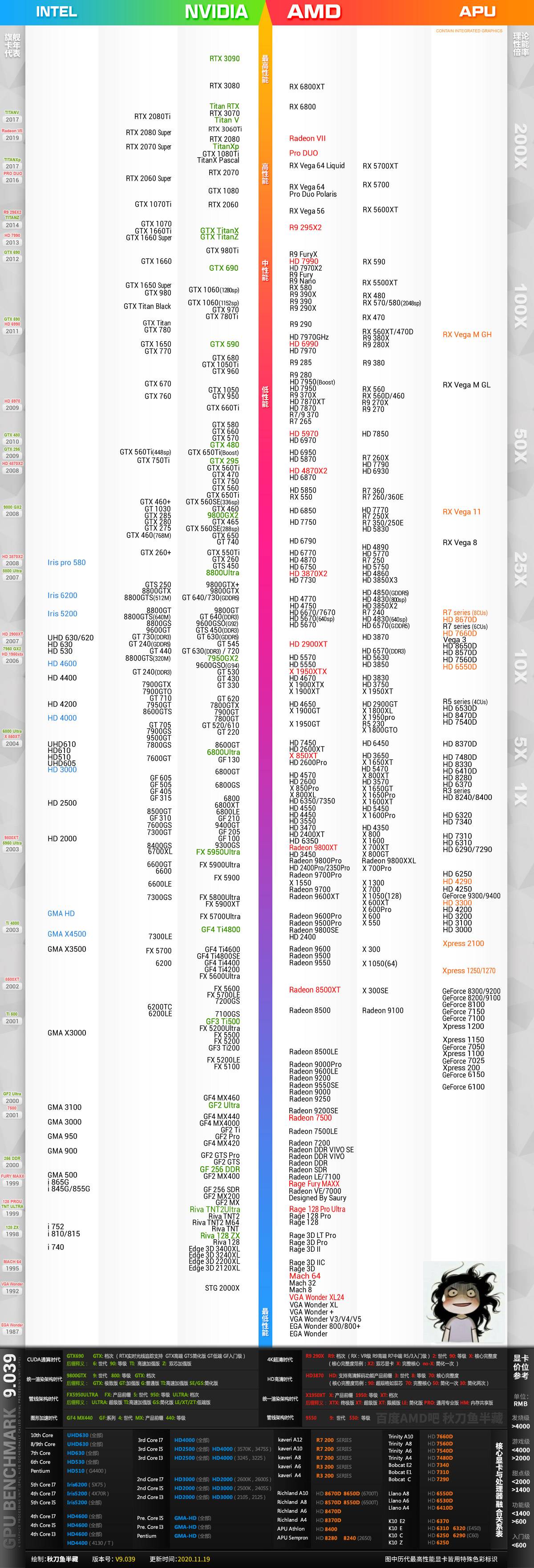 当然显卡天梯图是由百度贴吧网友秋刀鱼半藏手动整理绘制的,而且坚持免费分享了很多年。目前更新时间在 2020 年 11 月 19 号,算是相对来说比较新的显卡数据统计了。对于还在不知道如何找到更完整的显卡天梯图用户来说,那么这张图片中包含显卡名称以及显卡各方面的数据足够给予你参考。更多电脑软硬件知识欢迎浏览装机吧主页学习交流。